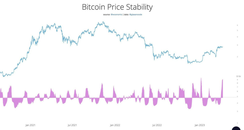Finalmente, en su último argumento, Willy Woo yuxtapone dos gráficos. El primero es la estabilidad de precios de Bitcoin y el segundo es la liquidez del libro de órdenes. Ambos sugieren que, como dice el analista, “el aumento de la volatilidad es casi una certeza”.