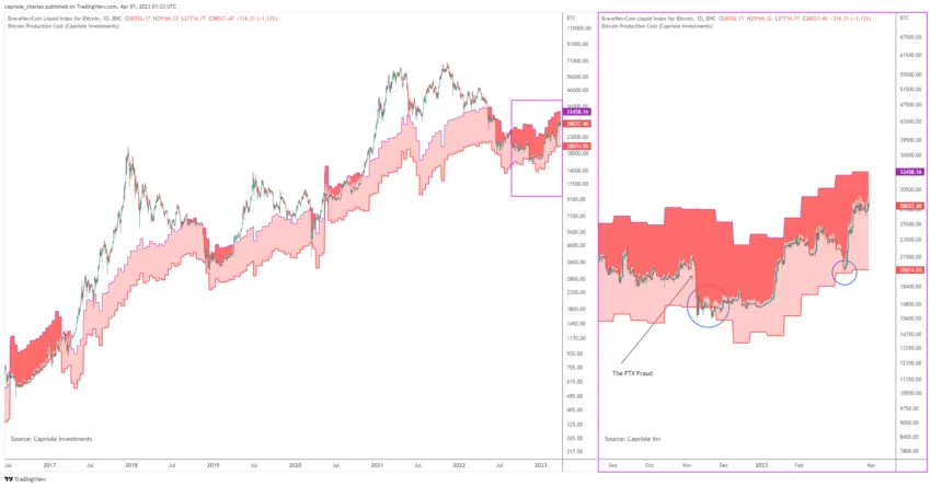 A través de una publicación en Twitter, Charles Edwards llamó la atención sobre el gráfico, que refleja el comportamiento de Bitcoin en el contexto de los cambios en el costo de su minería. Señaló que la criptomoneda comienza a aumentar cada vez que ocurren estas condiciones: