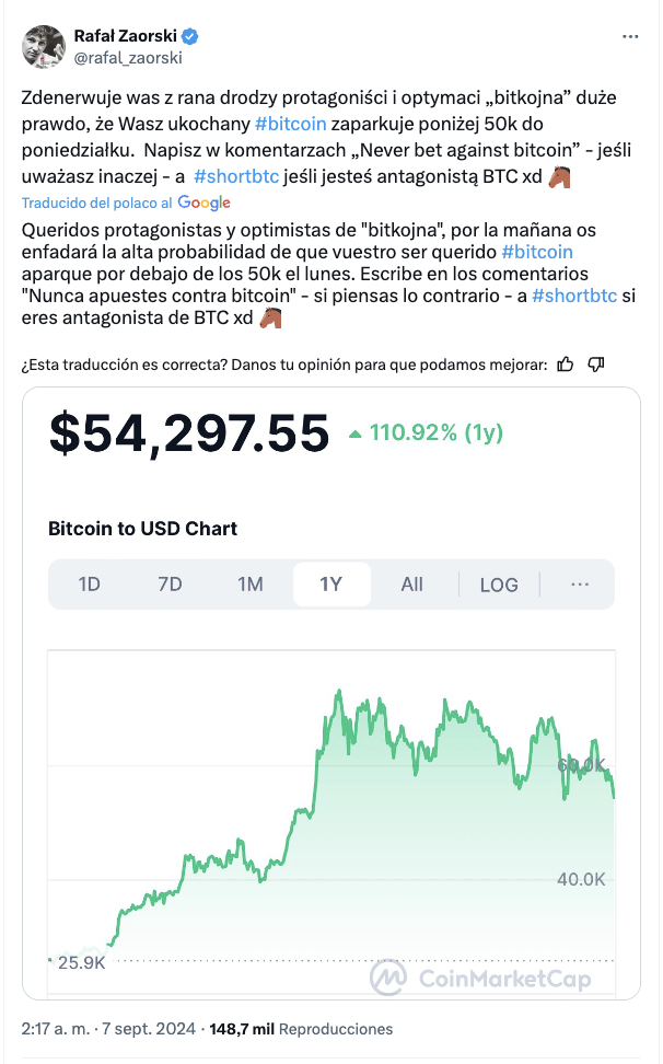 Zaorski es una figura que ha sido controvertida durante años. Sus predicciones suelen ser acertadas, por lo que tiene muchos seguidores y detractores. Esta vez sugiere que el próximo fin de semana puede traer nuevas caídas, lo que lleva a muchos inversores a ser cautelosos. Su confianza en la dirección en la que se moverá el precio de Bitcoin se puede observar leyendo sus propias publicaciones en la plataforma X: