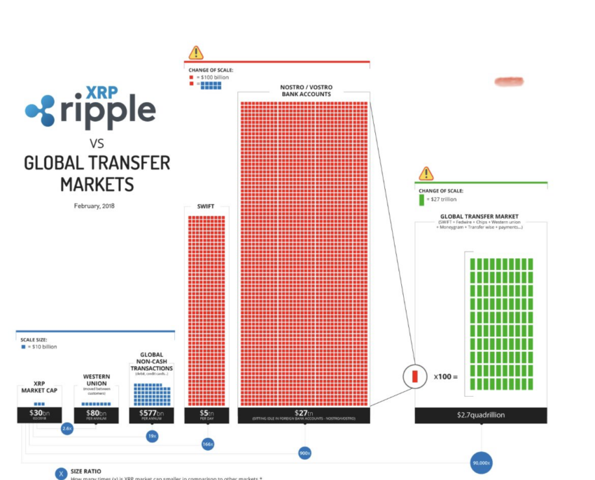 La imagen muestra la capitalización de mercado de XRP en comparación con el volumen de transacciones de los gigantes de pagos Western Union (80 mil millones de dólares) y SWIFT (5 billones de dólares).