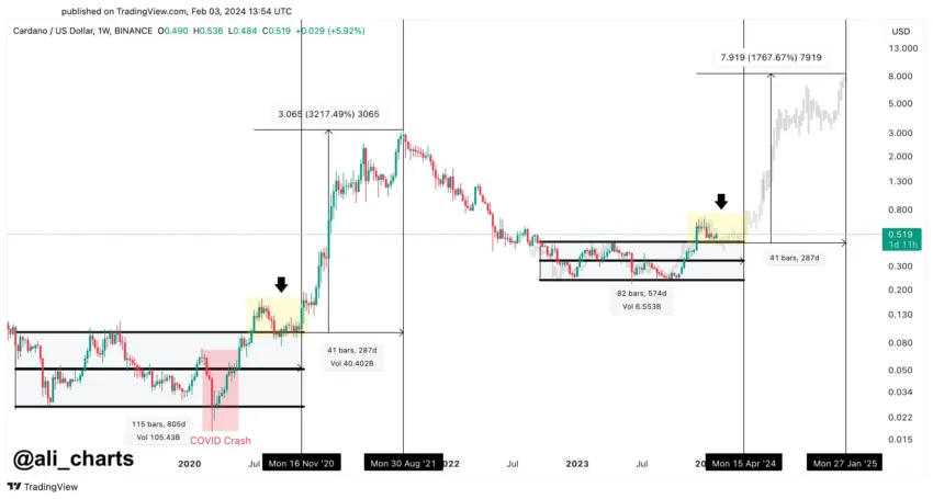 Del mismo modo, la historia puede repetirse con una fase de consolidación prolongada que se extienda hasta abril de 2024 antes de una carrera alcista que alcance un máximo de aproximadamente 8 dólares en enero de 2025. Un escenario tan alcista implica una subida extraordinaria del 1,797,67% en el precio de ADA.