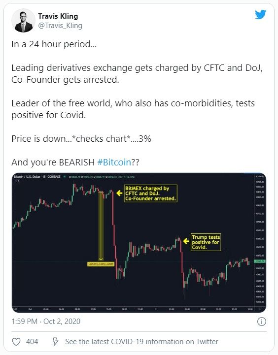SponsoredTambién observó cuando salieron las noticias de BitMEX por primera vez que el retroceso en el precio de Bitcoin palideció en comparación con el de un “evento de liquidación adecuado en BitMEX”. Él predice que el barrido regulatorio es alcista tanto para la adopción de Bitcoin como para el precio de BTC a mediano y largo plazo.