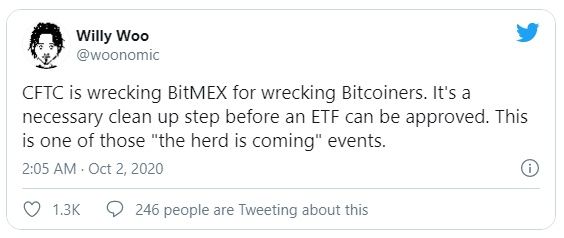 El popular analista de criptomonedas Willy Woo sugiere que la “bola de demolición” de la CFTC golpeó a BitMEX por “destruir bitcoiners”, y lo llamó una “limpieza necesaria” para que un ETF (fondo cotizado en bolsa, en español) de Bitcoin vea la luz del día. Woo cree que es un momento decisivo en el espacio de las criptomonedas, llamándolo “uno de esos grandes eventos está por venir”.