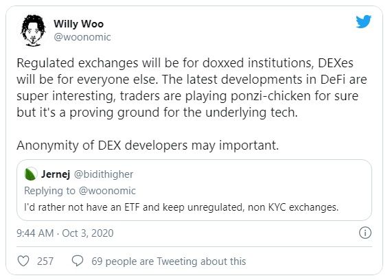 No todos los participantes del mercado cripto están obsesionados con tener un ETF de bitcoin. Argumentan que la industria ha llegado tan lejos sin uno, y se preguntan si es realmente necesario dada la avalancha de demanda de finanzas descentralizadas (DeFi). En respuesta, Woo tuiteó:
