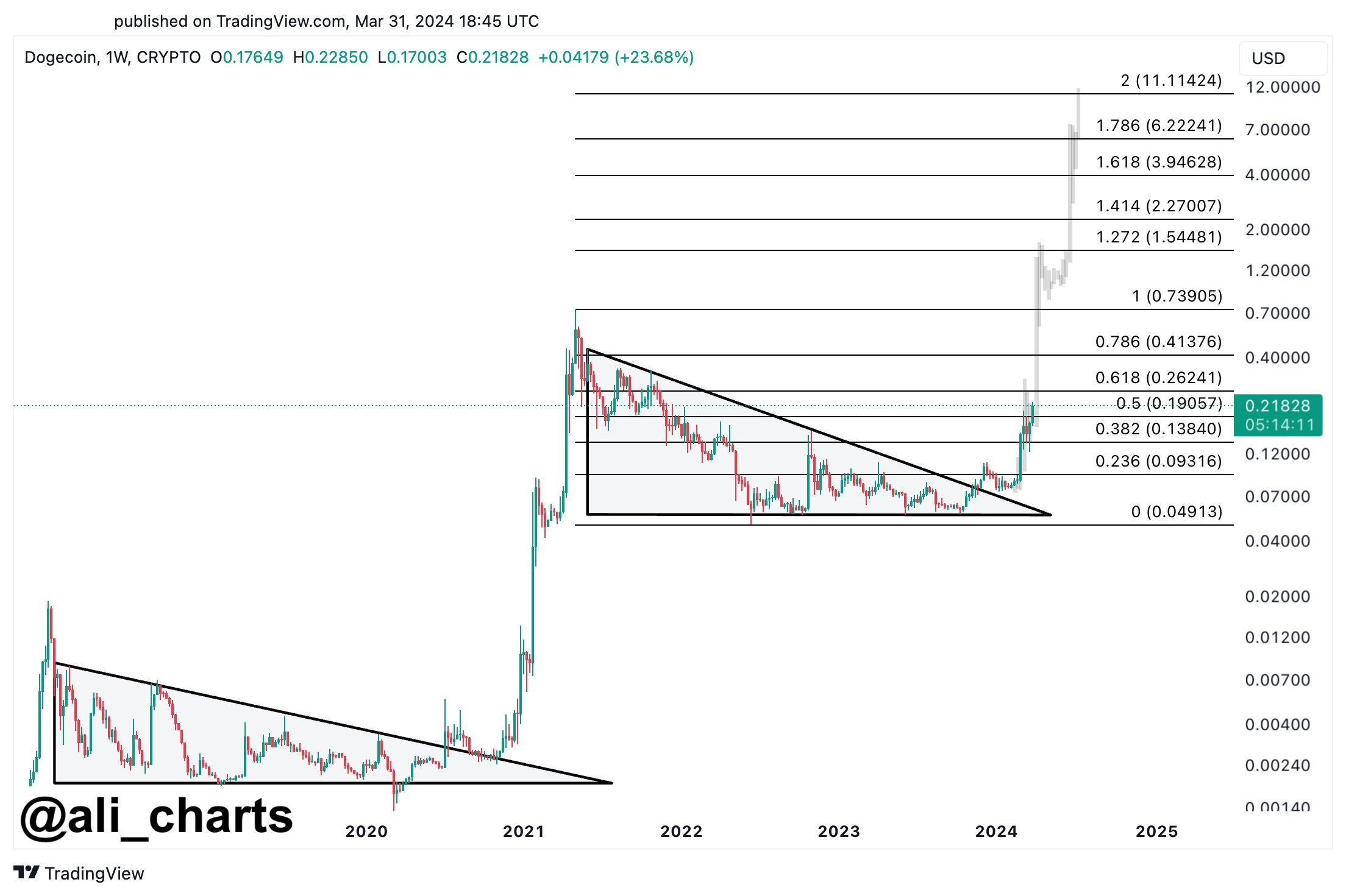 “Siento que mis compañeros degens se han distraído con las nuevas #memecoins, pero #Dogecoin sigue siendo la #altcoin más importante en este sector. Desde una perspectiva técnica, #DOGE parece reflejar el patrón 2018-2021. Si es así, ¡$DOGE podría estar al comienzo de un rally alcista parabólico masivo!”