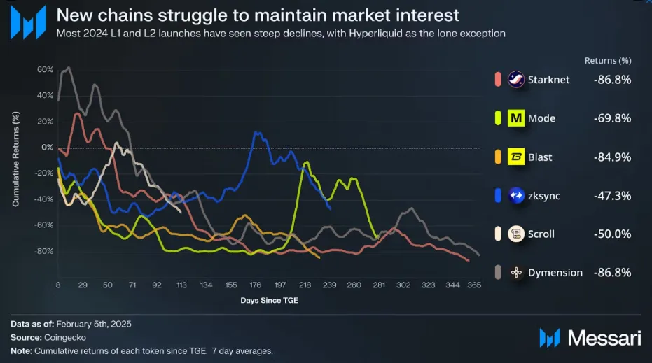 Desde sus lanzamientos de tokens, proyectos como Starknet, Mode, Blast, zkSync, Scroll y Dymension han experimentado fuertes caídas. La excepción notable a esta tendencia es Hyperliquid, cuyo precio del token HYPE ha aumentado un 1100%. Esto resalta la rareza del éxito en medio de un mar de cadenas en dificultades. Históricamente, los desbloqueos de tokens a gran escala han perjudicado los precios.
