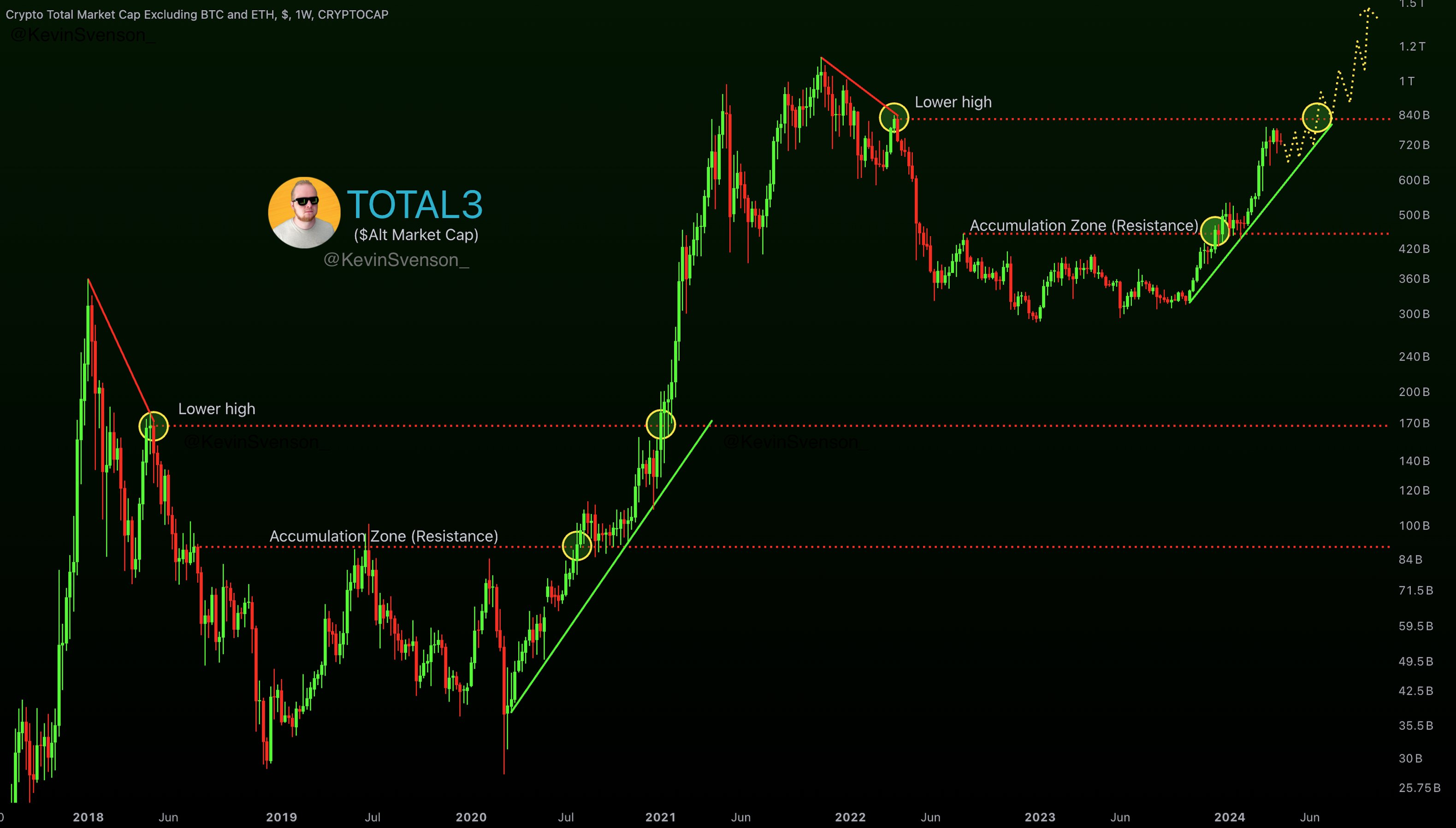 En una reciente comunicación a sus seguidores, el analista Kevin Svenson postuló que el altcoin market cap está preparado para un considerable rally alcista.