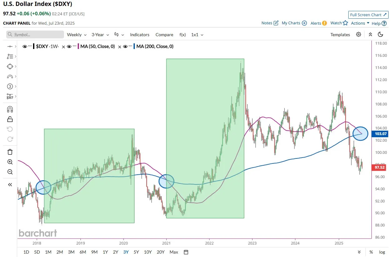 Esto se considera una señal bajista, lo que a menudo lleva a los traders a anticipar más caídas de precios. Sin embargo, Barchart señaló que las dos últimas veces que esto ocurrió (2018 y 2021), marcó el fondo del mercado. Por lo tanto, aunque la señal es bajista, las tendencias históricas sugieren que podría indicar un posible rebote para el dólar.