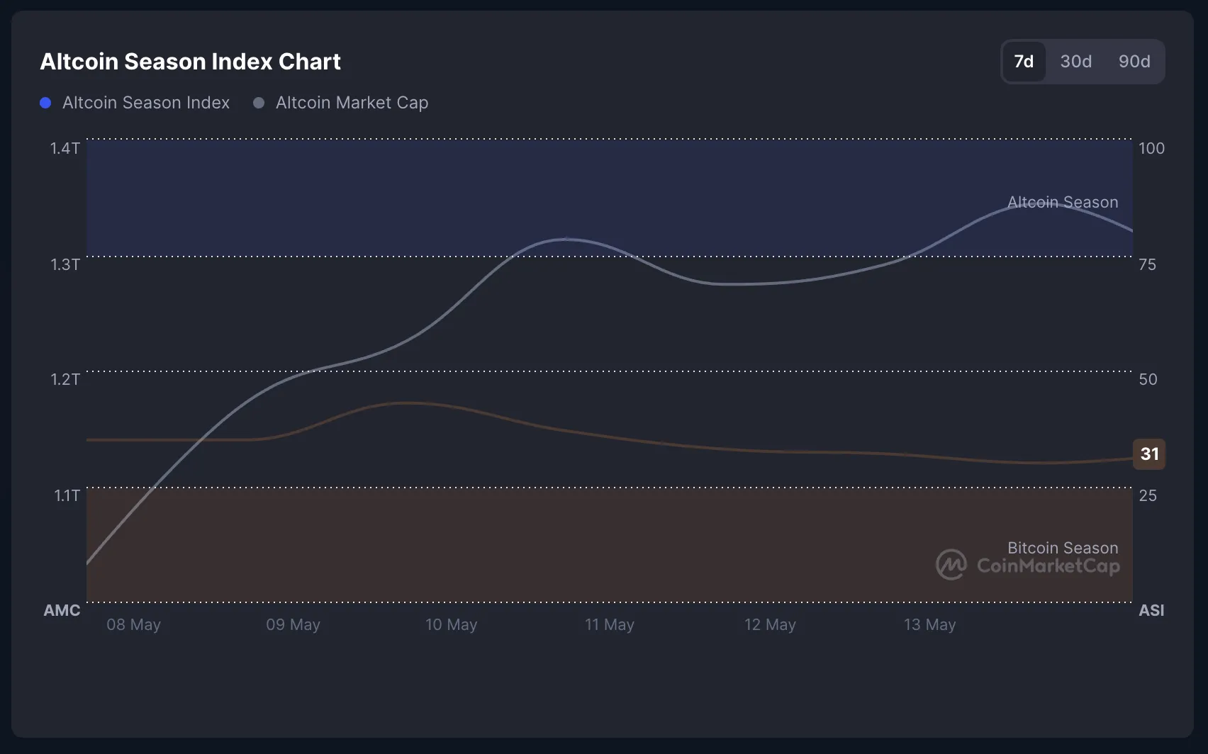 La capitalización total del mercado de altcoins ha aumentado en la última semana, subiendo de 1,07 billones de dólares a 1,30 billones de dólares—un aumento significativo que señala fuertes entradas en el sector de altcoins. A pesar de este crecimiento, el Índice de Altseason de CoinMarketCap ha disminuido de 35 a 31 en el mismo período, mostrando que la mayoría de las altcoins aún están rindiendo por debajo de Bitcoin.
