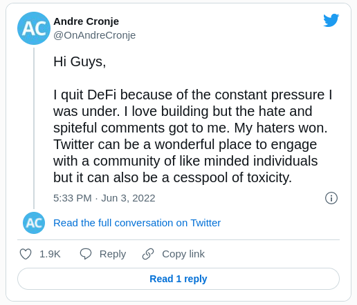 En Twitter, una cuenta, @OnAndreCronje, ha sido particularmente notoria por hacerse pasar por Andre Cronje. La cuenta afirmó que el arquitecto DeFi estaba de vuelta en el mundo cripto, pero “construyendo en privado”.