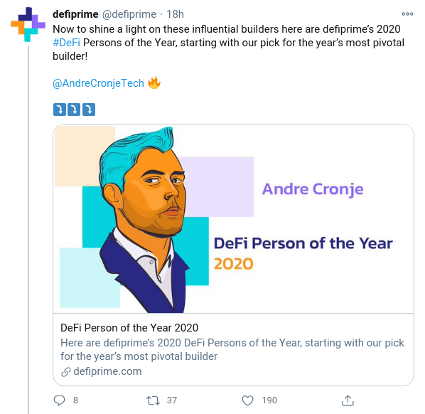 Stani Kulechov, cofundador y director ejecutivo de Aave, fue nominado porque desde enero el equipo del protocolo de préstamos solo ha tenido lanzamientos de alta calidad. El token AAVE nativo del protocolo también ha sido el activo DeFi con mejor rendimiento de 2020 con un aumento de alrededor del 5.000% desde principios de año.