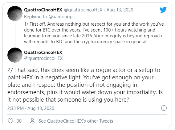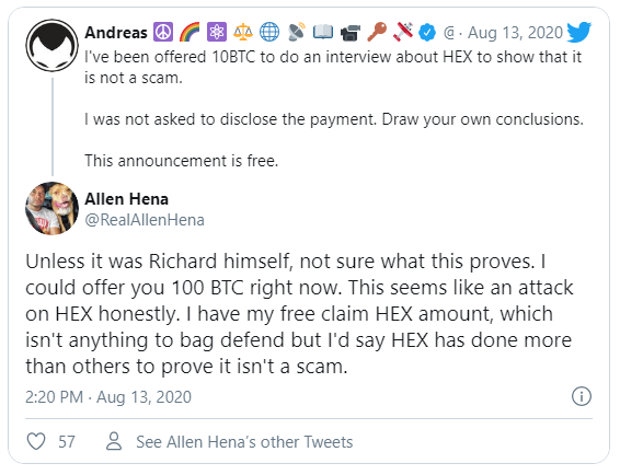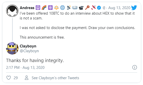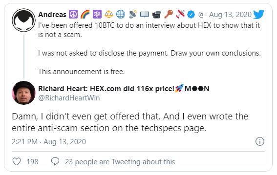 El influencer de criptomonedas Andreas Antonopoulos tuiteó que se le pidió que dijera que la moneda HEX no era una estafa. Antonopolous informa que la fuente anónima le ofreció 10 BTC (aproximadamente 115,000 dólares) para hacer una entrevista.