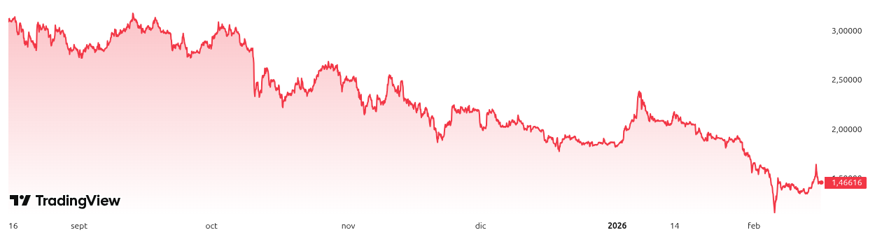 XRP cotiza actualmente alrededor de 1.40-1.45 dólares, tras una caída del 30% durante el último mes y un intento de recuperación impulsado por entradas institucionales. Como altcoin con fuerte adopción en pagos transfronterizos y vínculos con Ripple, XRP ha mostrado sensibilidad a la liquidez asiática y a eventos macro