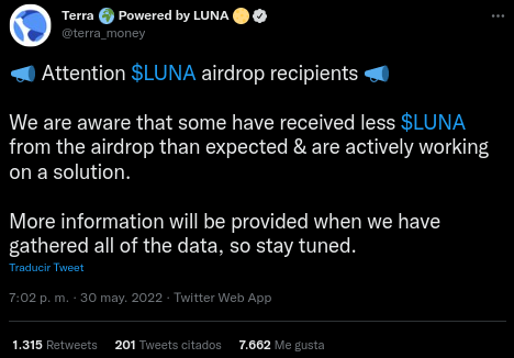 SponsoredVarios inversores recurrieron a Twitter para denunciar sus problemas por no recibir completamente la distribución prometida del airdrop de LUNA.