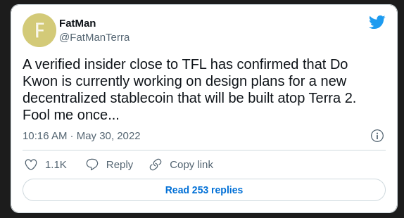 SponsoredPor otra parte, el popular “FatMan” dio a conocer que una fuente cercana reveló que Do Kwon estaba en el proceso de diseñar planes para una nueva stablecoin descentralizada que se construiría sobre Terra 2.0.