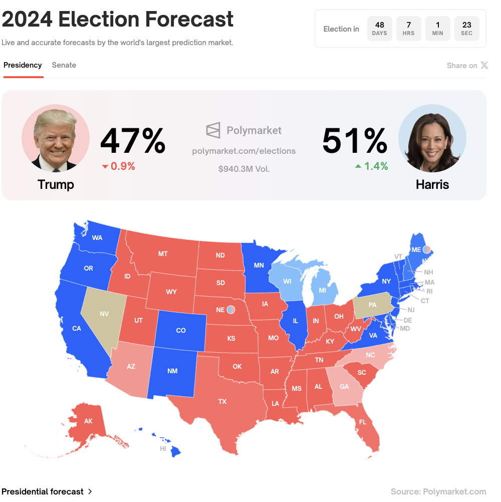 Datos de Polymarket mostraron que las tendencias electorales favorecen a la candidata demócrata, Kamala Harris, quien tiene el 51% de las preferencias, por encima del candidato republicano, Donald Trump, quien posee el 47% de las preferencias electorales. Harris supera en 4% a Trump.