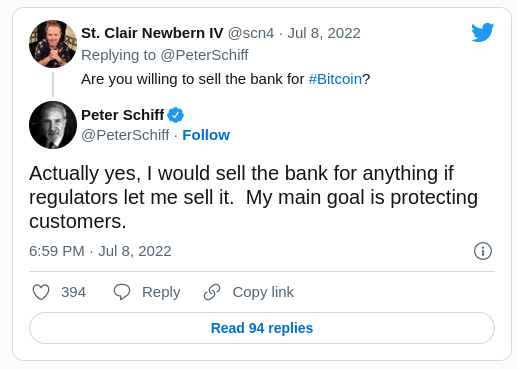 “En realidad, sí, vendería el banco por cualquier cosa si los reguladores me permitieran venderlo”, dijo Schiff, en respuesta a la pregunta de un usuario que quería saber si estaría dispuesto a vender el banco por BTC. “Mi objetivo principal es proteger a los clientes”.