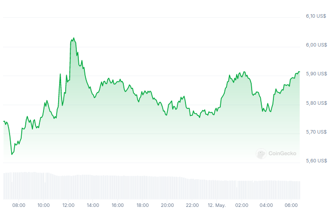 A pesar de no tener un vínculo directo con OpenAI, el precio de Worldcoin (WLD) ha experimentado un leve aumento del 3% en las últimas 24 horas. Al momento de la publicación, WLD cotiza en 5.91dólares, acumulando ganancias del 12.7% en la última semana.