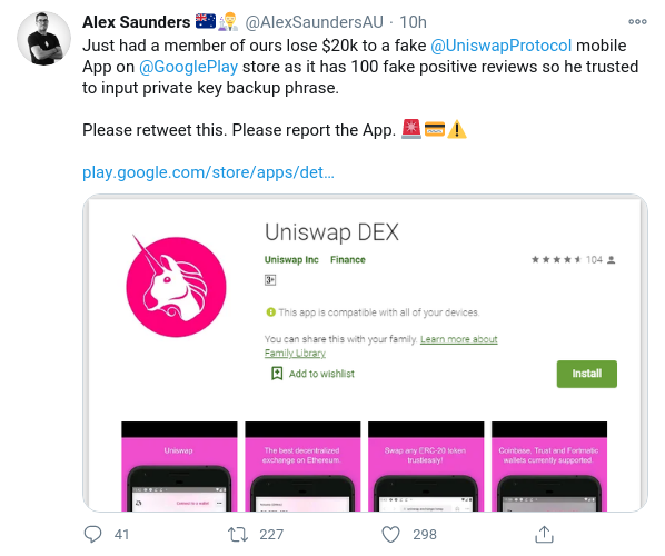 Según Alex Saunders, el fundador de Nuggets News, hay una aplicación de Uniswap falsa disponible para descargar en Google Play Store. En el momento de la redacción del artículo, Google no ha eliminado la aplicación maliciosa.