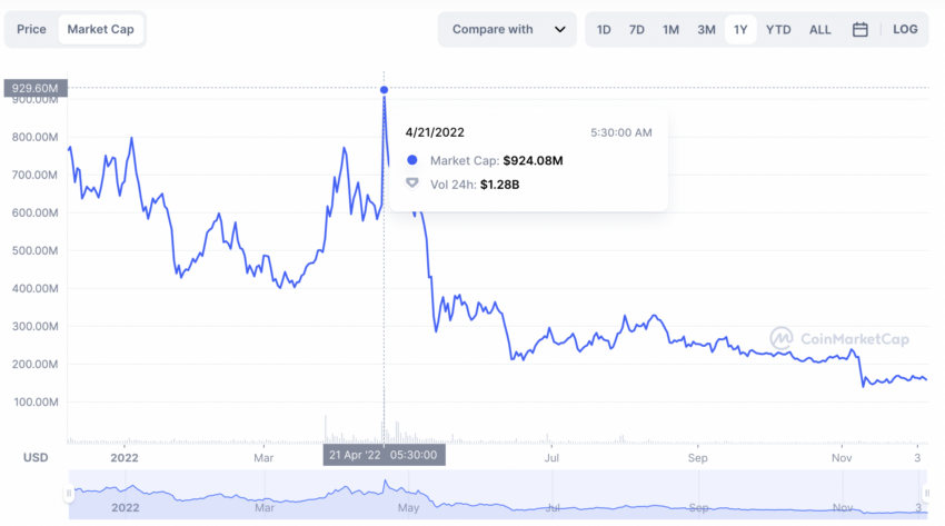 A 16 de octubre de 2022, ambas cantidades han caído significativamente: un 83% la capitalización de mercado y un 98.8% el volumen de trading. Esta caída explicaría en gran parte la devaluación del token.