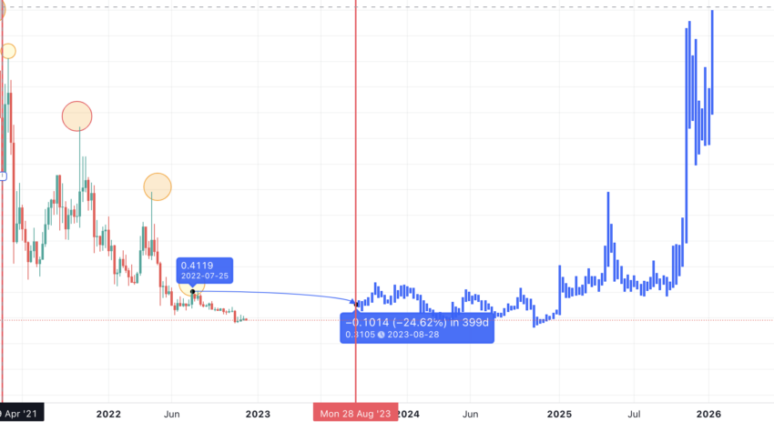 Por ende, el siguiente máximo debería alcanzarse en 399 días partiendo del 25 de julio de 2022. Este punto debería encontrarse un 24% por debajo de la línea de los 0.4293 dólares, asumiendo que una pérdida del 24% es equivalente a una ganancia del 32%.