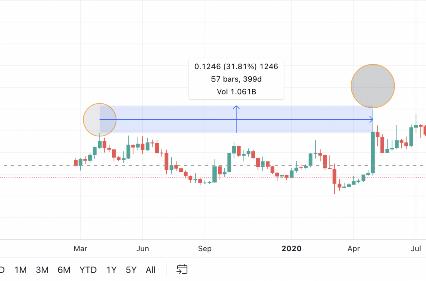 SponsoredMediremos el cambio porcentual entre el primer y el segundo máximo del primer patrón para predecir la formación de un nuevo máximo. La diferencia es de 399 días, lo que supone una proporción aproximada del 32%.