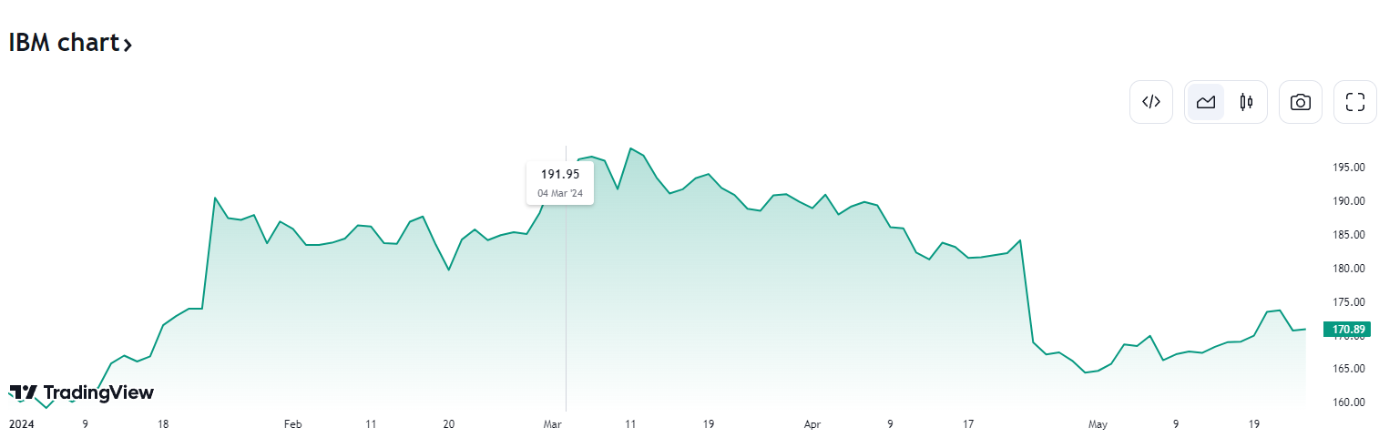 El gráfico de cotizaciones de IBM indica un año dinámico en 2024. A partir de marzo, las acciones experimentaron fluctuaciones caracterizadas por caídas y recuperaciones. Sin embargo, a lo largo del año, la cotización de IBM se va recuperando.