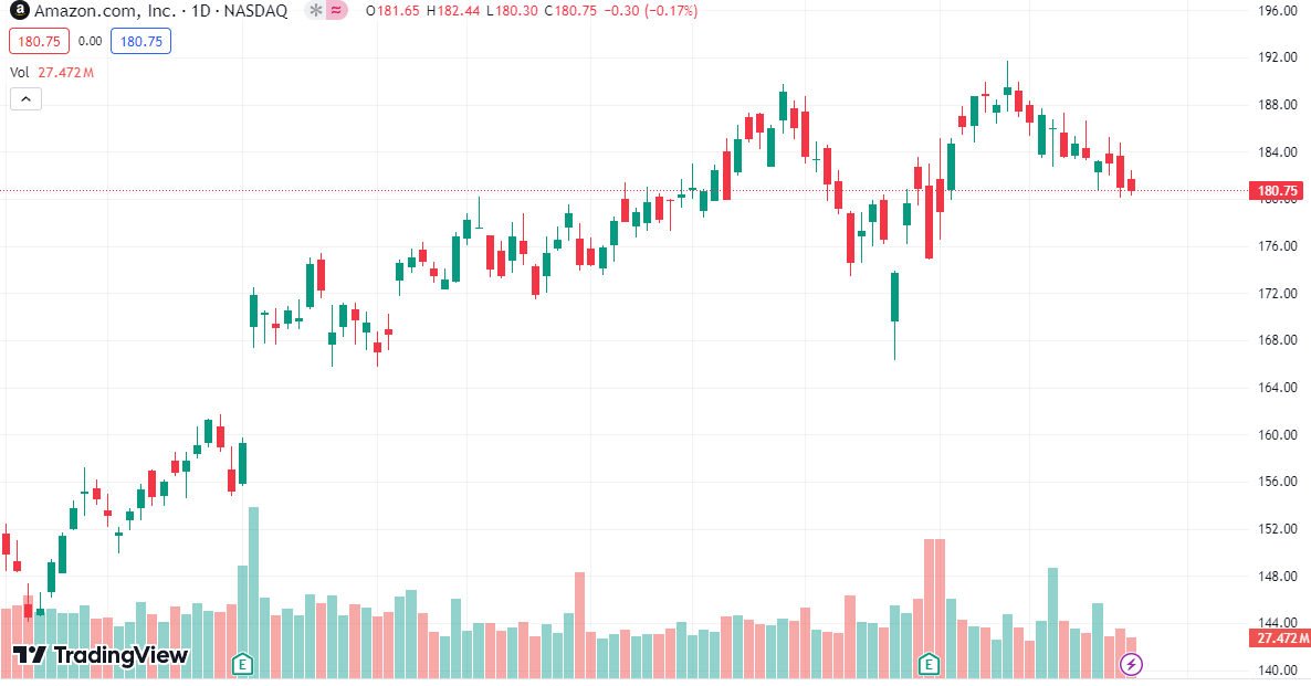 En 2023, el precio de las acciones de Amazon ascendió constantemente y dicha tendencia se ha mantenido en lo que va de 2024, como indica la prevalencia de velas verdes en el gráfico. Aunque las velas rojas muestran cierta volatilidad del mercado, la tendencia general sigue positiva, con un mayor volumen de negociación que apuntaba a un creciente interés de los inversores.