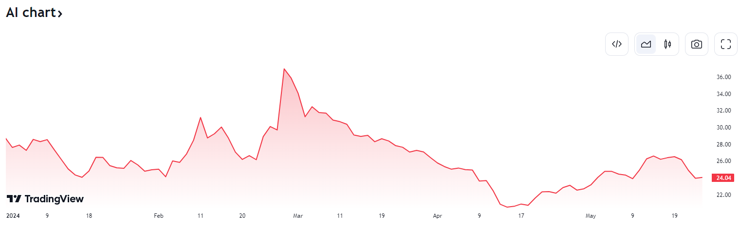 Estas acciones de inteligencia artificial a lo largo del 2024 han sido bastante inestables. El rendimiento a largo plazo muestra un descenso del 75.96% en cinco años, en línea con su tendencia a lo largo de la vida. La valoración de mercado de C3.ai es actualmente de 2,856 millones de USD, con un objetivo de precio futuro de las acciones de 26,42 USD. Para el momento de redacción de esta nota, su precio ronda los 24,04 USD.
