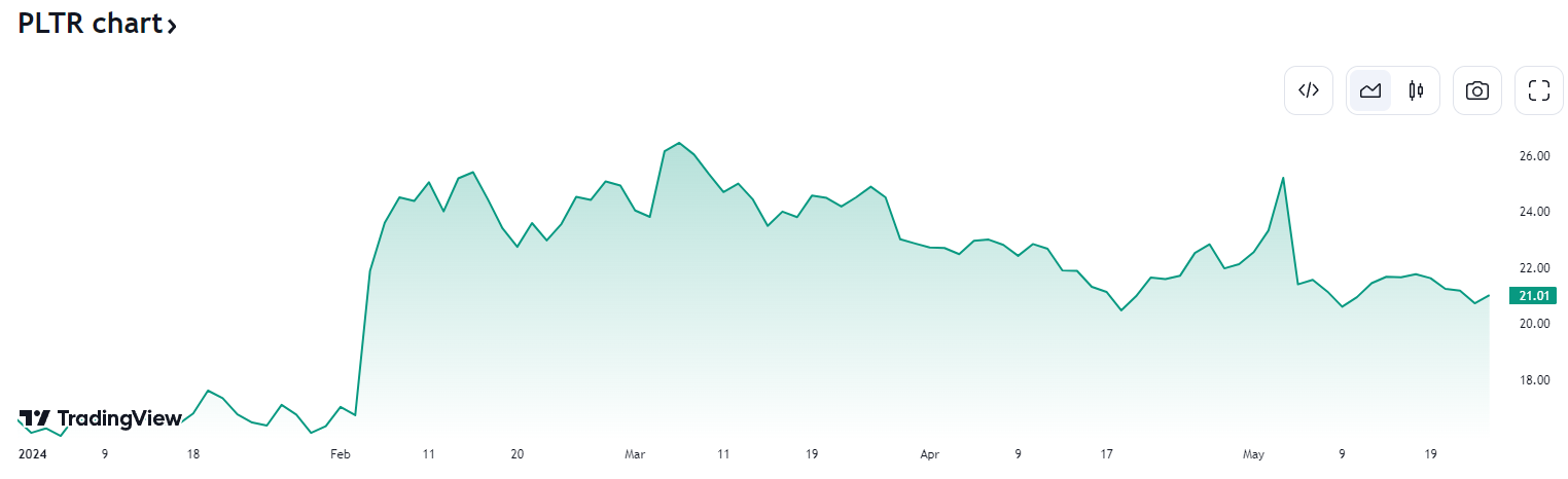 En medio del auge de la industria de la IA, el valor de las acciones de Palantir en lo que va de año se disparó un 23.95%, mientras que sus ingresos en el tercer trimestre crecieron hasta superar los 210 millones de dólares, superando las estimaciones del mercado y consolidando su estatus en el sector del análisis de datos y la IA. Para mayo del 2024, el precio de estas acciones de inteligencia artificial se encuentran en los 21.01 USD.