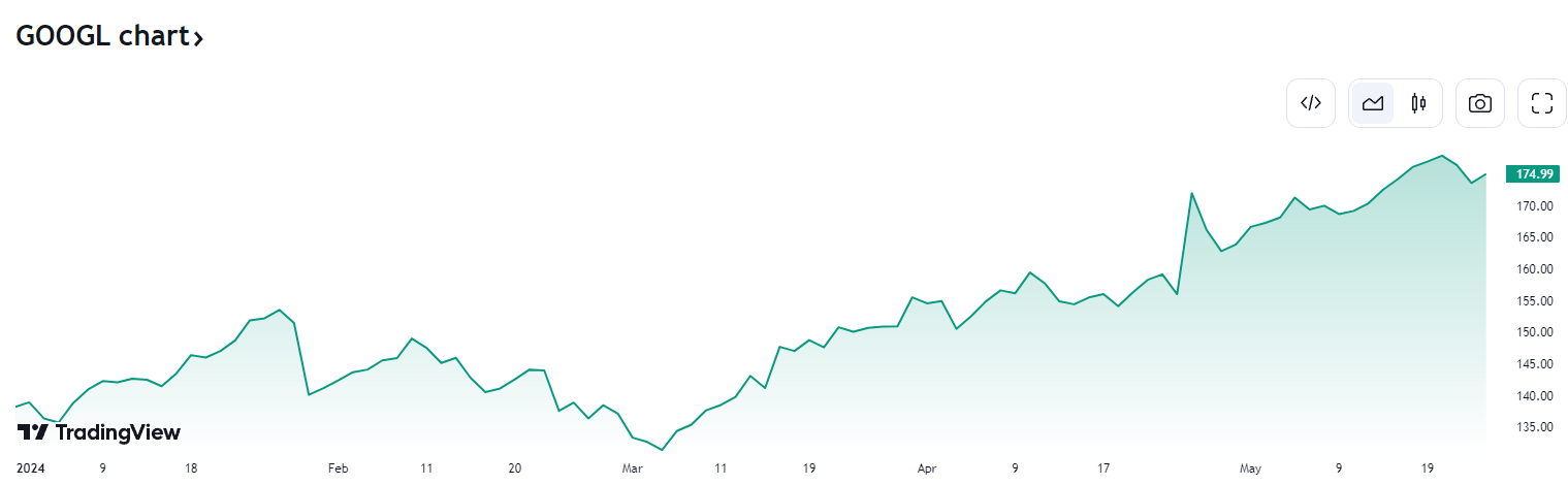 SponsoredLa capitalización bursátil de Alphabet, empresa matriz de Google, se sitúa en 2.17 billones de USD a finales de mayo del 2024, y está respaldada por un ratio PE de 26.62 y un EPS de 6.58 USD. Con un rango de 23 semanas de 138.17 a 174.99 USD, Alphabet ofrece actualmente una rentabilidad por dividendo del 0.46 %, y los analistas fijan una estimación objetivo a 1 año de esta acción de IA en 189.50 USD.
