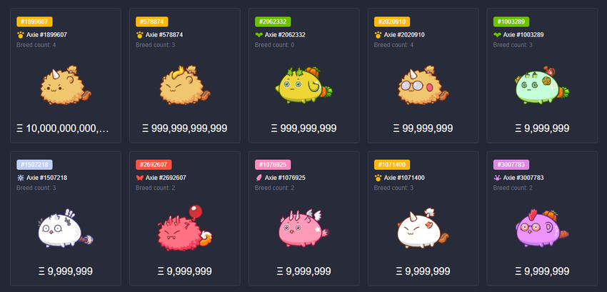 Los Axies se venden en la actualidad por entre 200 dólares y 300 dólares en ETH. El potencial de ganancias sorprendentemente alto de la plataforma impulsa el precio de los NFT y los tokens del juego. ¡Se han negociado más de 90,000 ETH en el mercado interno de Axie Infinity!