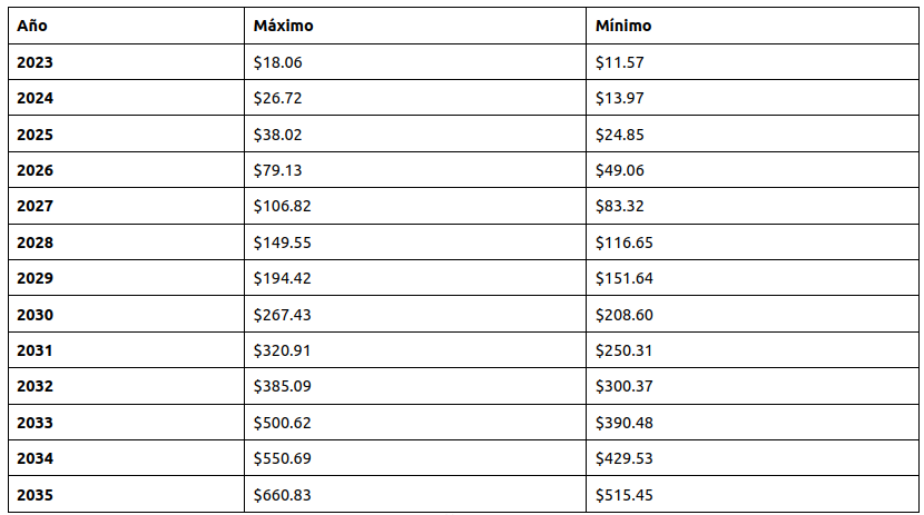 Habría que considerar la posible formación de un patrón de acumulación, aunque podríamos dibujar una fluctuación del 56.78% (en base a los datos de la segunda tabla). Estaríamos hablando de un máximo anual de 18 dólares en 2023.