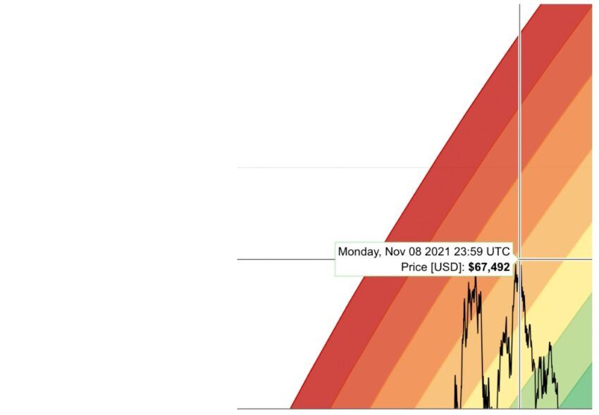 Veamos un ejemplo. El 8 de noviembre de 2021, Bitcoin se encontraba en la banda naranja claro. El precio rozaba los 67,500 dólares. Un par de meses después se observó una recogida de beneficios significativa.