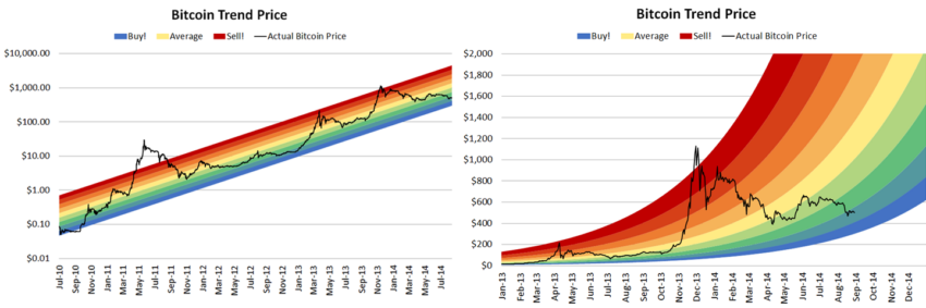 La cuestión es cómo encajan Bitcoin Rainbow Chart y el modelo de regresión logarítmica. La propuesta de Azop se basaba en simples bandas de colores cuya evolución respondían a un movimiento lineal. Fue Trolololo quien aplicó la regresión logarítmica.