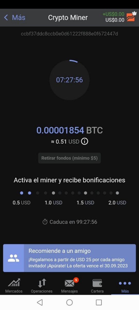 El monto mínimo para realizar trading es de 10 USD. Por lo que se aconseja acumular primero esa cantidad de minado para el primer retiro. Los fondos obtenidos en BTC son cambiados a USD y el proceso de fondeo de la cuenta suele tardar entre 5 minutos y 2 horas.