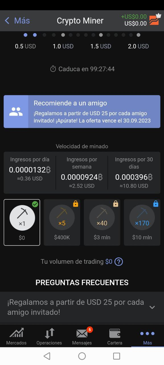 - El mínimo para retirar dinero es de 5 dólares, pero para operar en trading necesitas acumular al menos 10 dólares en el primer retiro.