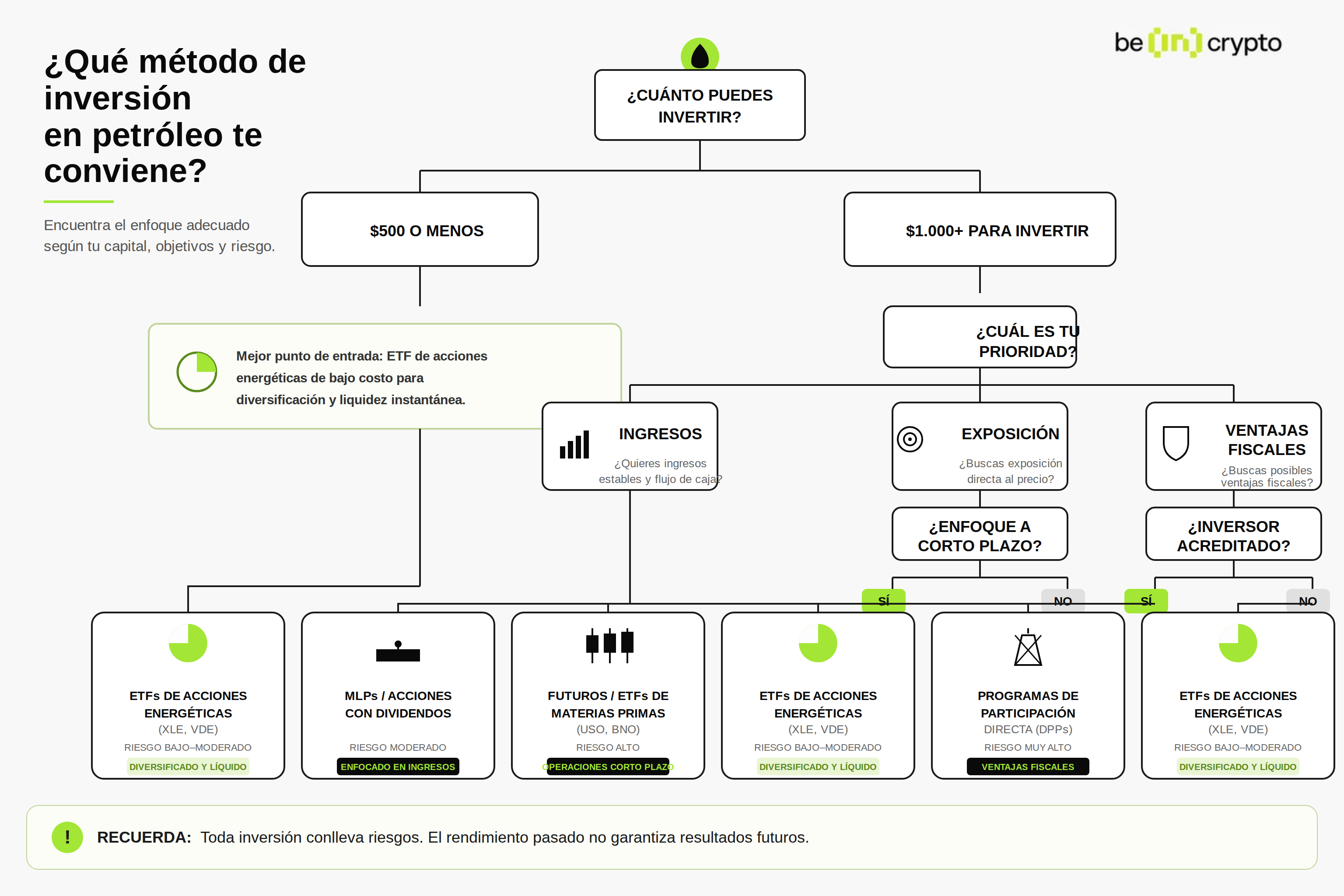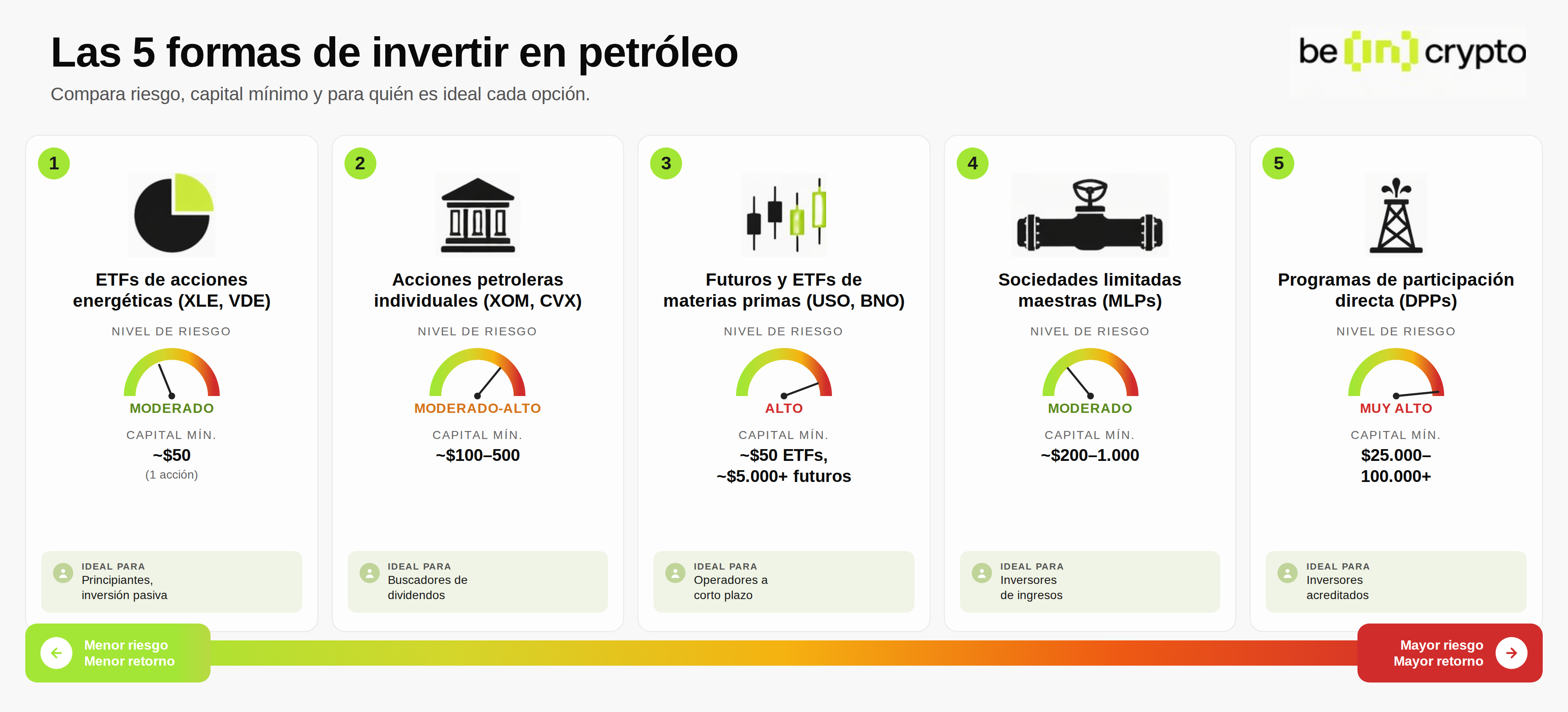 | Principiante con $500 o menos | ETF de acciones energéticas (XLE o VDE) | Mínimo bajo, diversificación instantánea, alta liquidez | Los rendimientos siguen al sector energético en general, no al precio del crudo |