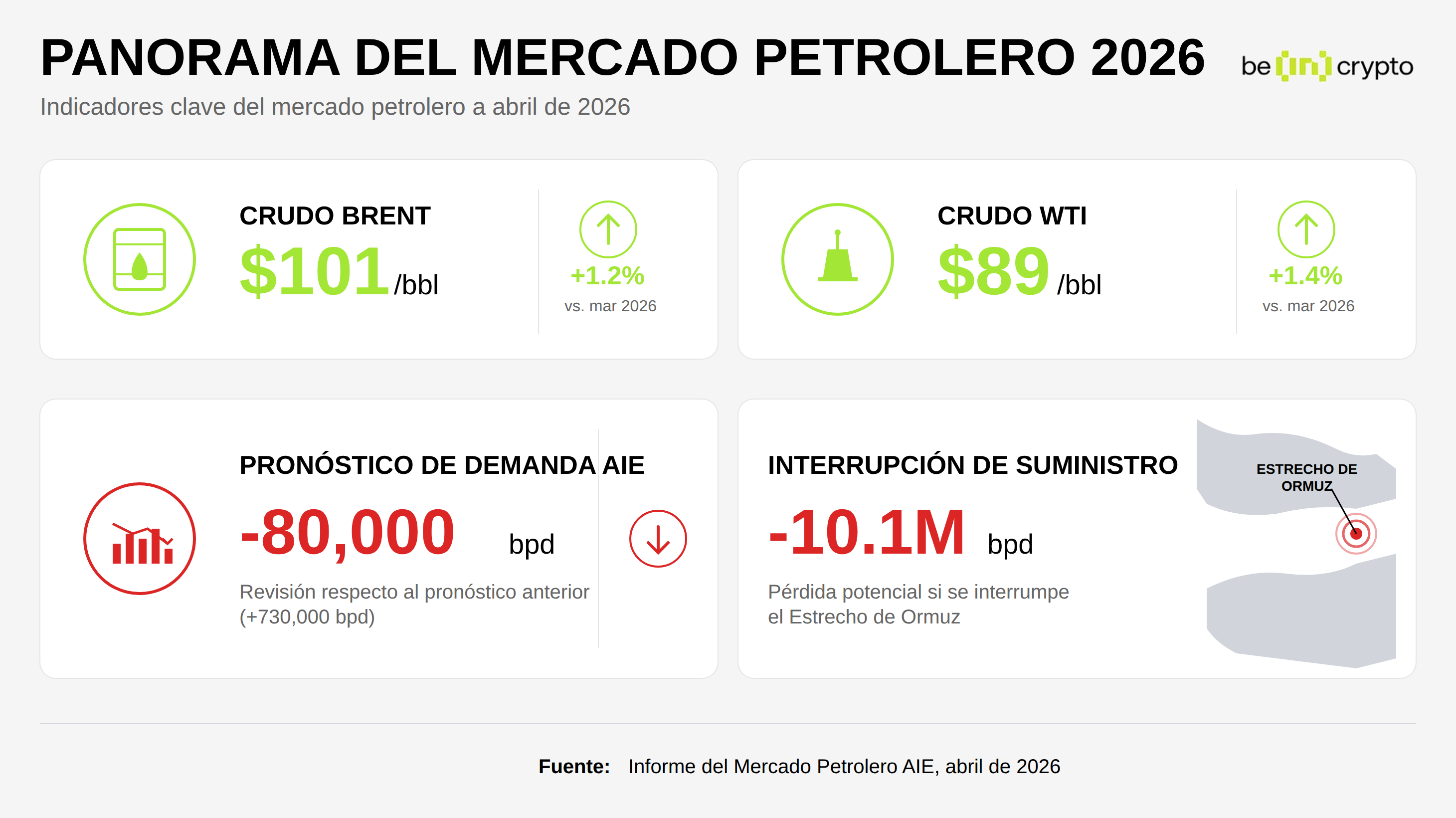 El cambio quedó claro en abril de 2026. La AIE, en su Informe sobre el Mercado del Petróleo de abril de 2026, revisó sus perspectivas de demanda, pasando de un crecimiento de 730.000 barriles diarios a una contracción de unos 80.000 barriles diarios. Este cambio se produjo cuando la crisis Irán-Ormuz provocó la mayor interrupción del suministro de la historia.
