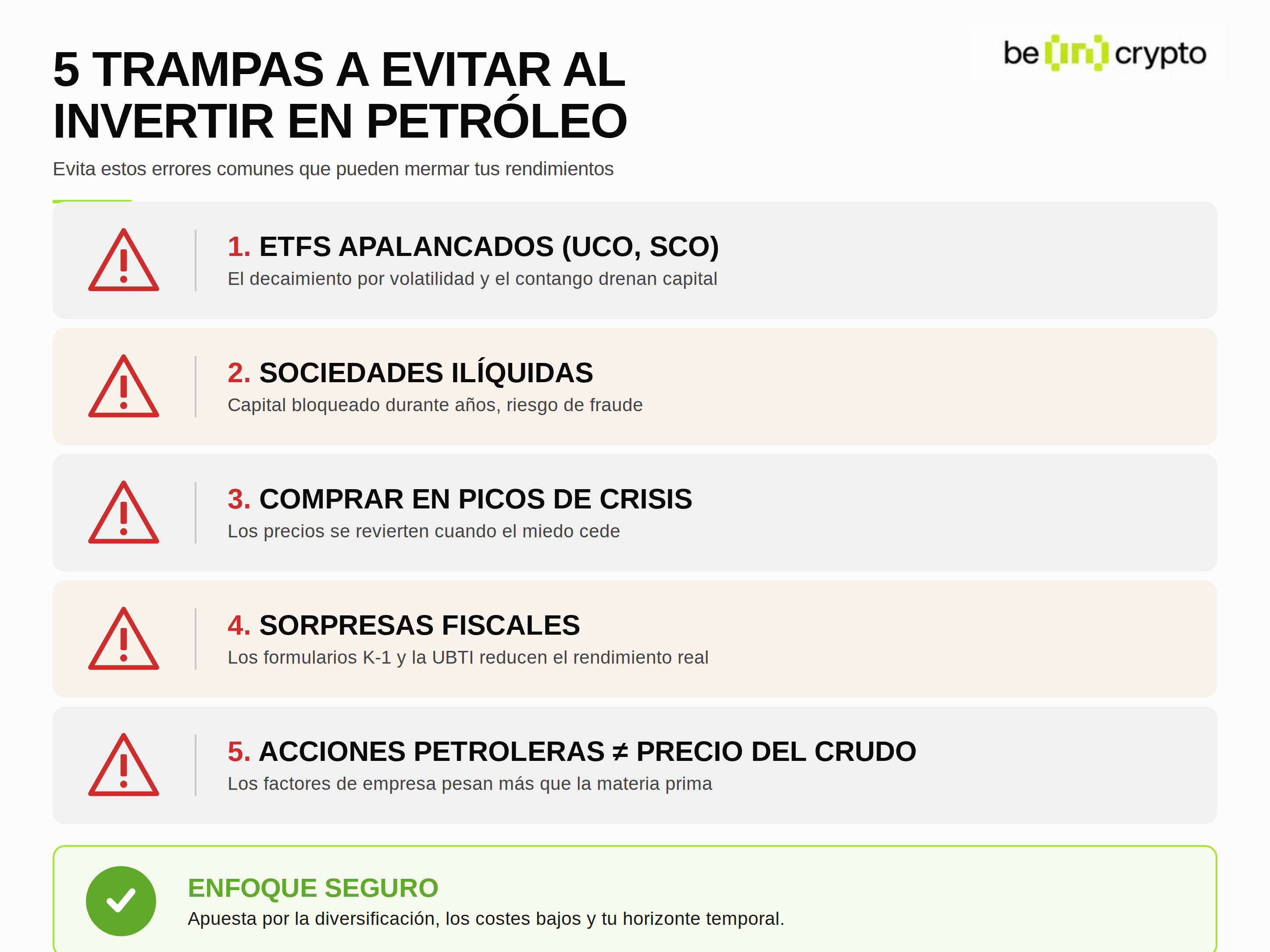 Las cinco trampas más comunes a la hora de invertir en petróleo son los ETF apalancados, las sociedades sin liquidez, comprar en picos de precios geopolíticos, ignorar la complejidad fiscal y confundir las acciones petroleras con apuestas sobre el precio del petróleo. Cada una de ellas puede erosionar los rendimientos incluso cuando su llamada direccional sobre el petróleo es correcta.
