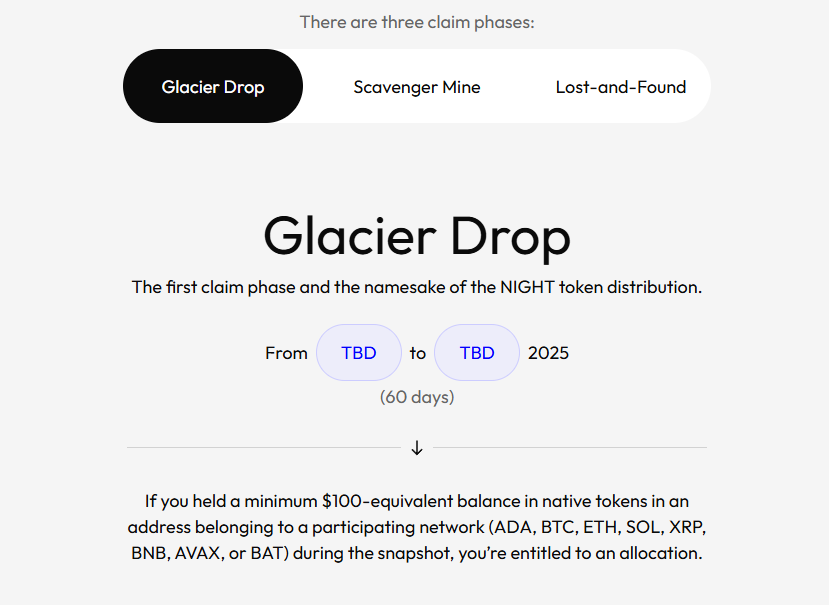 Ve al sitio oficial del evento de generación de tokens Midnight. Haz clic en la sección de reclamaciones de Glacier Drop. Verás información sobre la fase 1 y una opción para iniciar el proceso de reclamación.