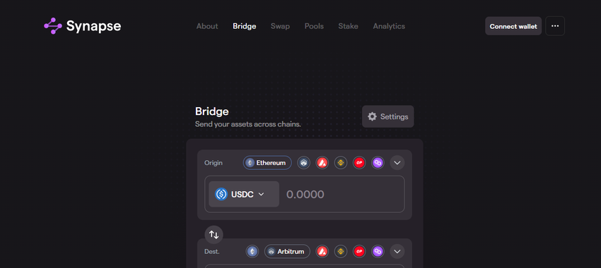 Synapse también está integrado en el ecosistema Metis, por lo que puedes mover tokens entre Ethereum y Metis a través de este protocolo. Sigue los siguientes pasos: