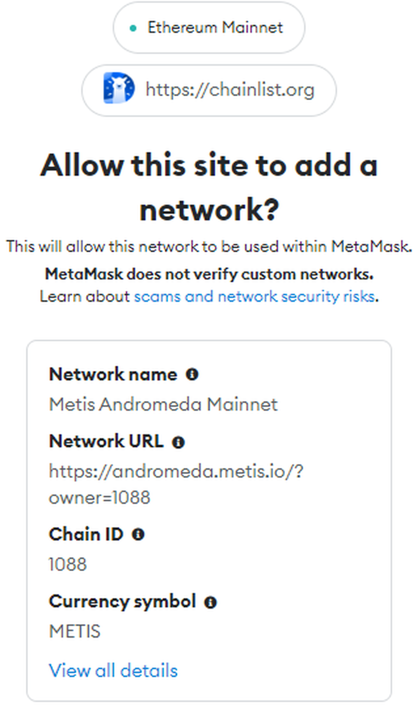 - Haz clic en “Approve” (debería añadirse Metis Andromeda Mainnet a MetaMask).