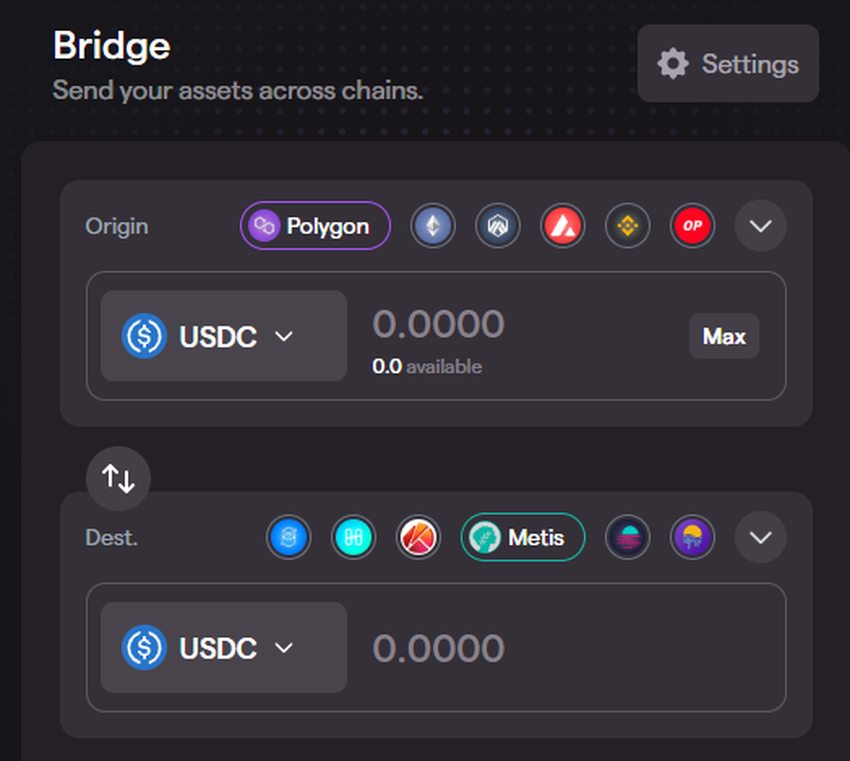 - Elige Ethereum como red de origen y Metis como red de destino.
