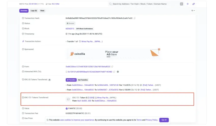 Al comprar un nodo de Wirex Pay, recibirás un NFT a modo de licencia. Se trata de un token ERC-721 que certifica la propiedad del nodo. Ten en cuenta que el NFT no aparece automáticamente en tu monedero. Para localizarlo e importarlo, sigue estos pasos: