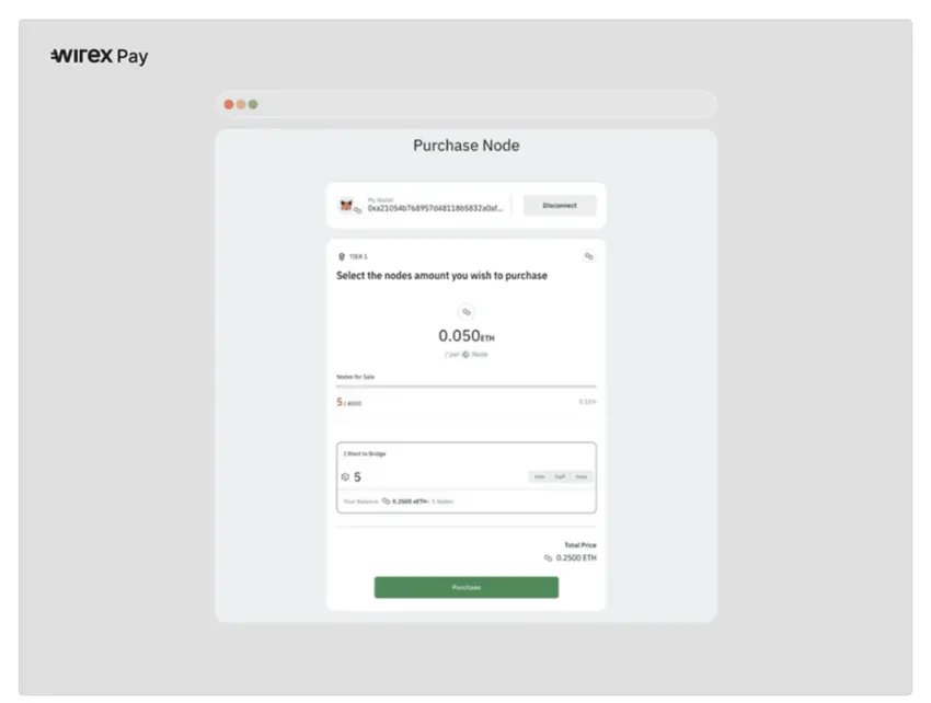 Elige el nivel en el que deseas invertir, haz clic en el botón “Comprar” y sigue las instrucciones. Asegúrate de que los nodos en tu nivel elegido estén disponibles y no se hayan agotado. Luego, confirma la compra y disfruta de tu nodo de Wirex Pay.