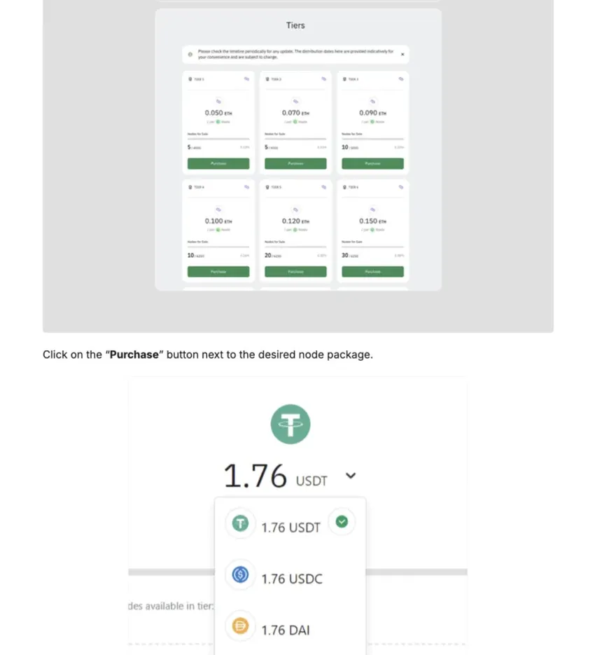 Una vez que tu billetera esté conectada con éxito, puedes comenzar a explorar los diferentes niveles disponibles. Asegúrate de tener suficientes USDT, USDC, DAI o wETH en el monedero para cubrir el coste de los nodos y las comisiones de red.