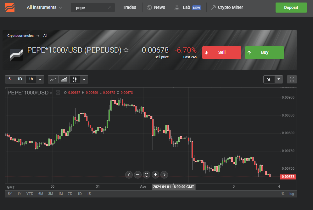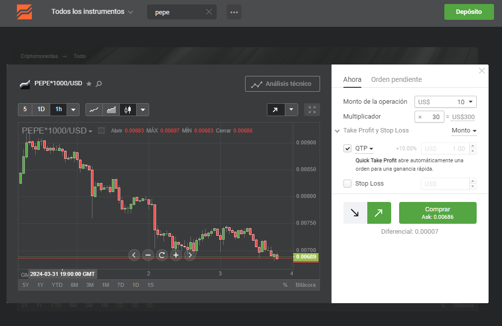 Libertex es unos de los brokers más sencillos y prácticos para comprar PEPE. Gracias, a su interfaz simplificada, sus usuarios pueden invertir en PEPE en pocos pasos, incluso estableciendo take profits y stop loss para configurar totalmente la estrategia de trading que desee. Aparte, como permite la compra de contratos de futuros, puede realizar apalancamiento financiero de hasta 30x para el par de cambio con PEPE.