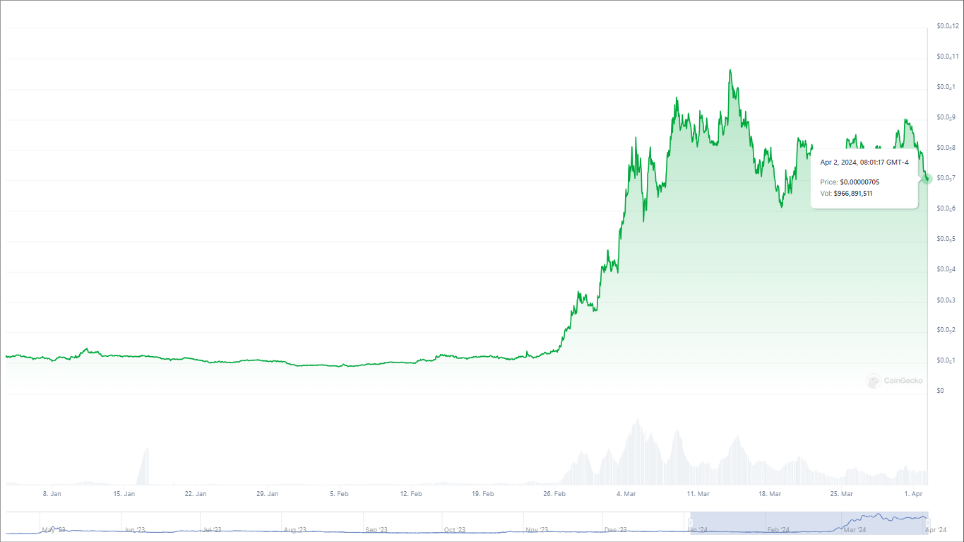 Históricamente, las memecoins han ofrecido rendimientos sorprendentes de la noche a la mañana, y PEPE no fue diferente. Su popularidad se disparó a los pocos días de su lanzamiento.
