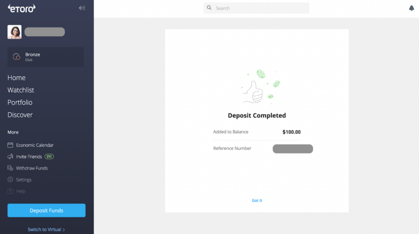 Al hacer clic en el botón de depósito, aparecerá una ventana donde deberás indicar la cantidad que quieres enviar a la app de inversión. Procura que sea mayor a 10 USD, ya que es el volumen mínimo para abrir una posición en eToro.